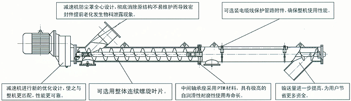 例:炭黑、纯碱、水泥、化肥、农药、面粉粮食等。 性能特点一高效率的输送:小直径、高转速、变螺距的螺旋体设计,确保产品在工作过程中顺畅、快速、均匀上料。一随意的布置:输送机的外壳采用优质无缝钢管通过法兰名段连接为整体,故整体刚性好,无论是水平,还是大倾角均可连续输送,并可直接与其配套的设备连接固定,无需地基基础,充分利用空间,移动、拆装十分方便。一良好的润滑:本公司专有PTM材料少油润滑滑动瓦加多层迷宫式油封设计以及由油泵,分配器,管路形成的集中润滑系统,使整机各运动付得到充分润滑,从而延长了整机的使用寿命。双重保护,自然更胜一筹。一可靠的密封:润滑密封可靠无渗漏,既无浪费物料,又创造了良好的工作环境,经改良的窥视孔装置无渗水和物料泄漏之忧。历经风雨侵袭却连续工作,且少有故障发生。一多元化的联接:进、出料口可采用万向节、布袋、法兰联接方式。