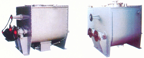 一该机通过两根等速反向旋转轴上特殊布置的桨叶,使物料作径向、环向、轴向三向运动,形成复合循环,在极短的时间内达到均匀混合。一可进行固(粉)—固(粉)(粉体粒度300—2000um)混合。一根据用户要求,还可以另加喷液及夹套装置,使之可作为固(粉)—液(含液量<15%的混合及干燥设备使用。