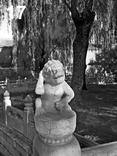 桥东,从南开始数,第四只狮子的形态最为奇特。它一爪摸着后脑勺,一爪护在裆部,嘴巴微张。虽然经过日久风吹,多少有些面目模糊,但它一副抓耳挠腮、欲说还休的“憋屈”样依然萌态十足。